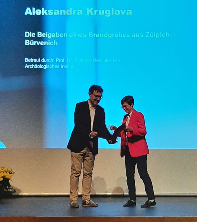 Am Freitag, den 14. Juli wurde Aleksandra für ihre Bachelorarbeit zum Thema „Die Leihgabe eines Brandgrabes aus Zülpich-Bürvenich“ der Fakultätspreis von Herrn Prof. Dr. Stefan Grohé, Dekan der Philosophischen Fakultät der Universität zu Köln, verliehen.